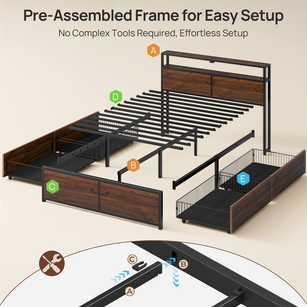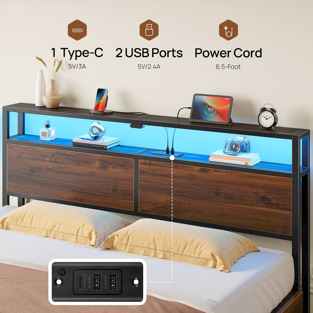 Rolanstar Queen Bed Frame with 4 Storage Drawers, Charging Station and LED Lights, Metal Platform Bed with 2-Tier Storage Headboard, No Box Spring Needed, Easy Assembly, Noise-Free, Walnut