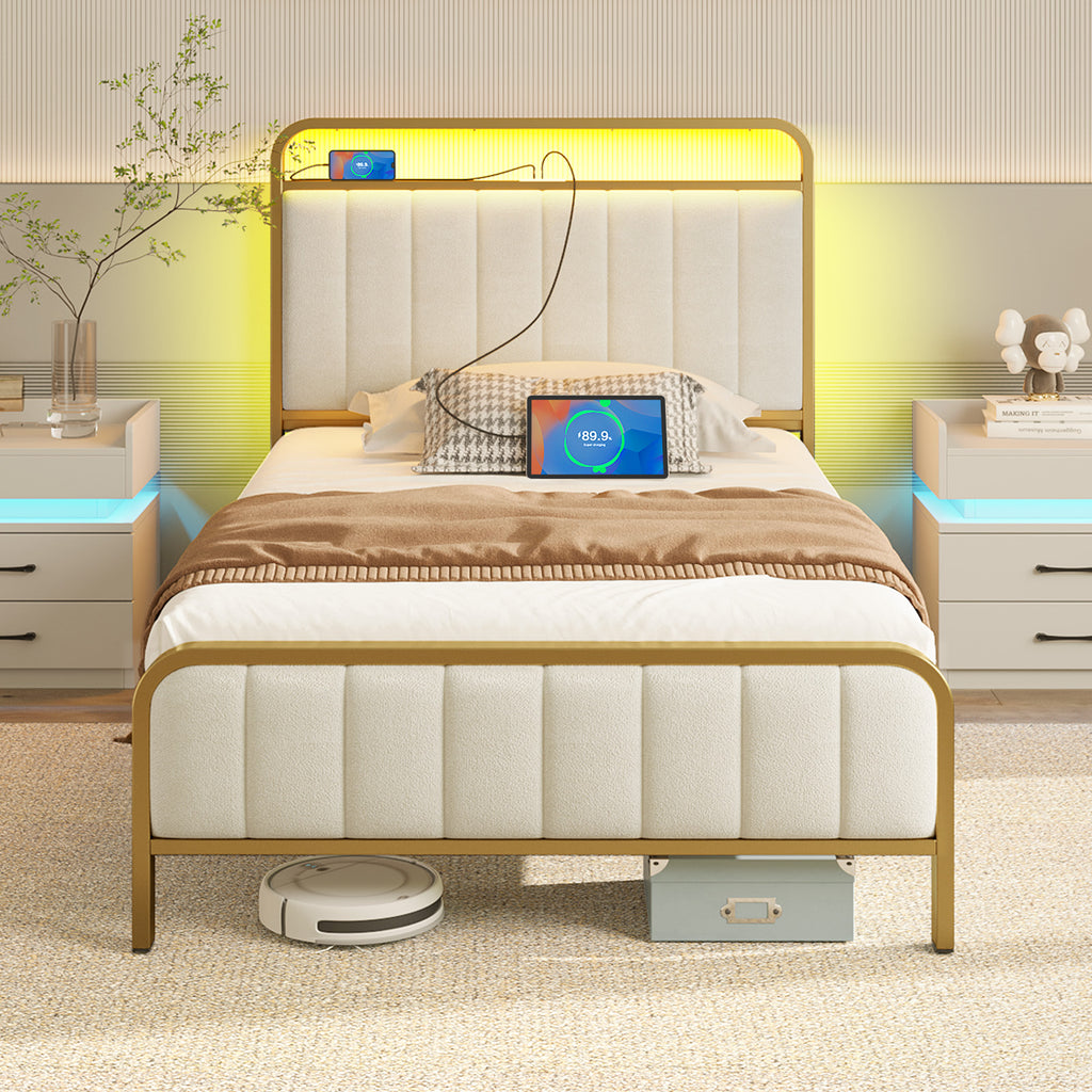 Rolanstar Bed Frame with Charging Station and LED Lights, Upholstered Velvet Bed with Headboard Footboard