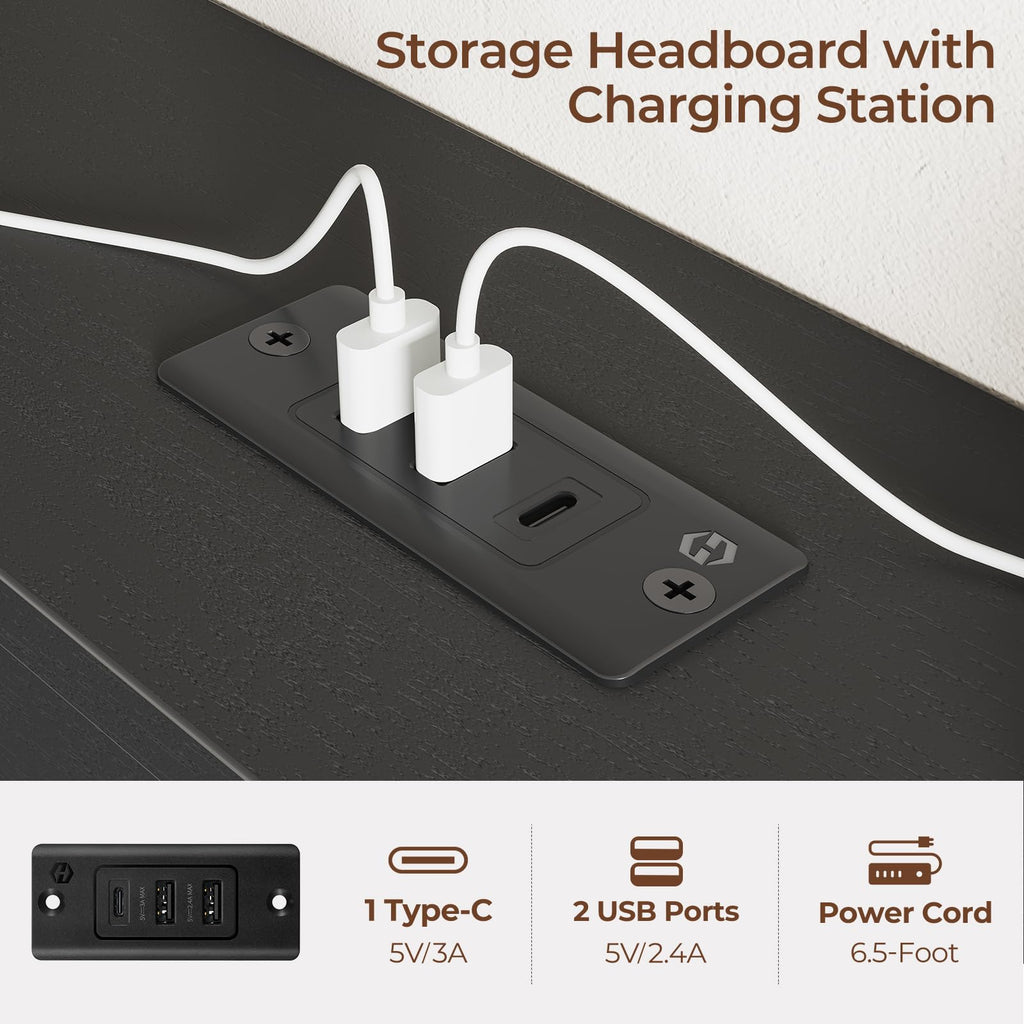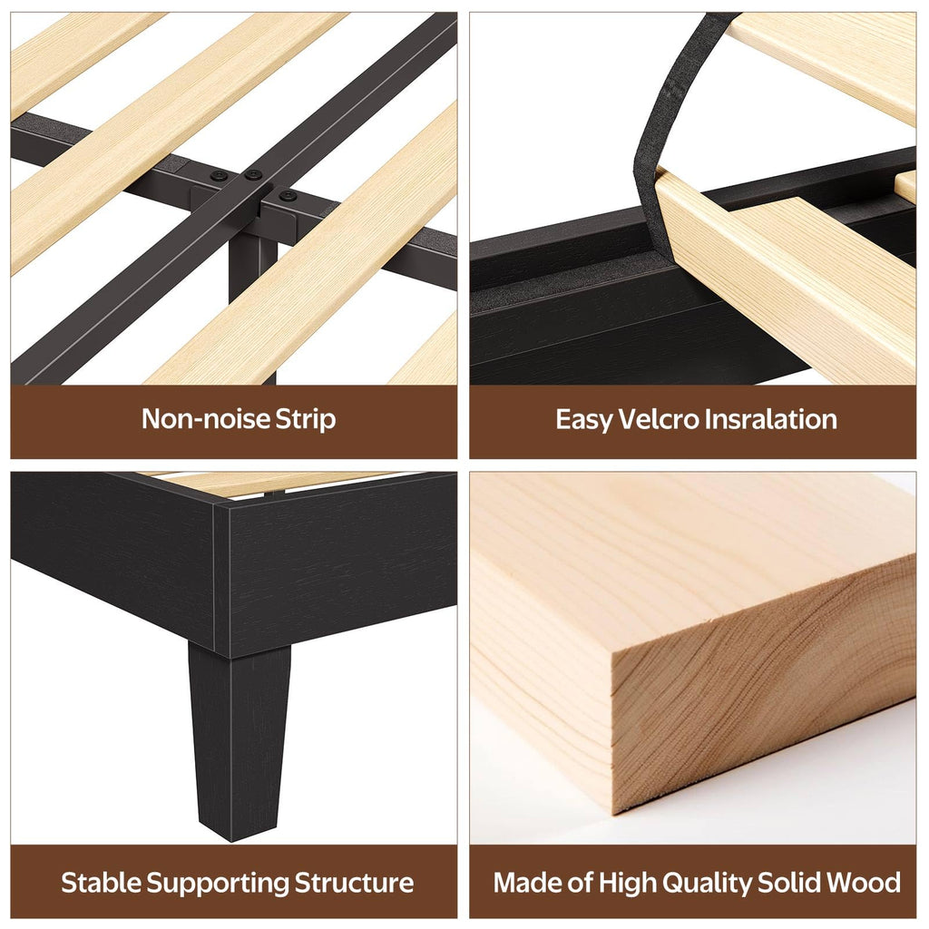 Rolanstar Twin Bed Frame with Headboard, Solid Wood Bed Frame Foundation with Wood Slat SupportCha, rging Station & LED Lights, No Box Spring Needed, Black